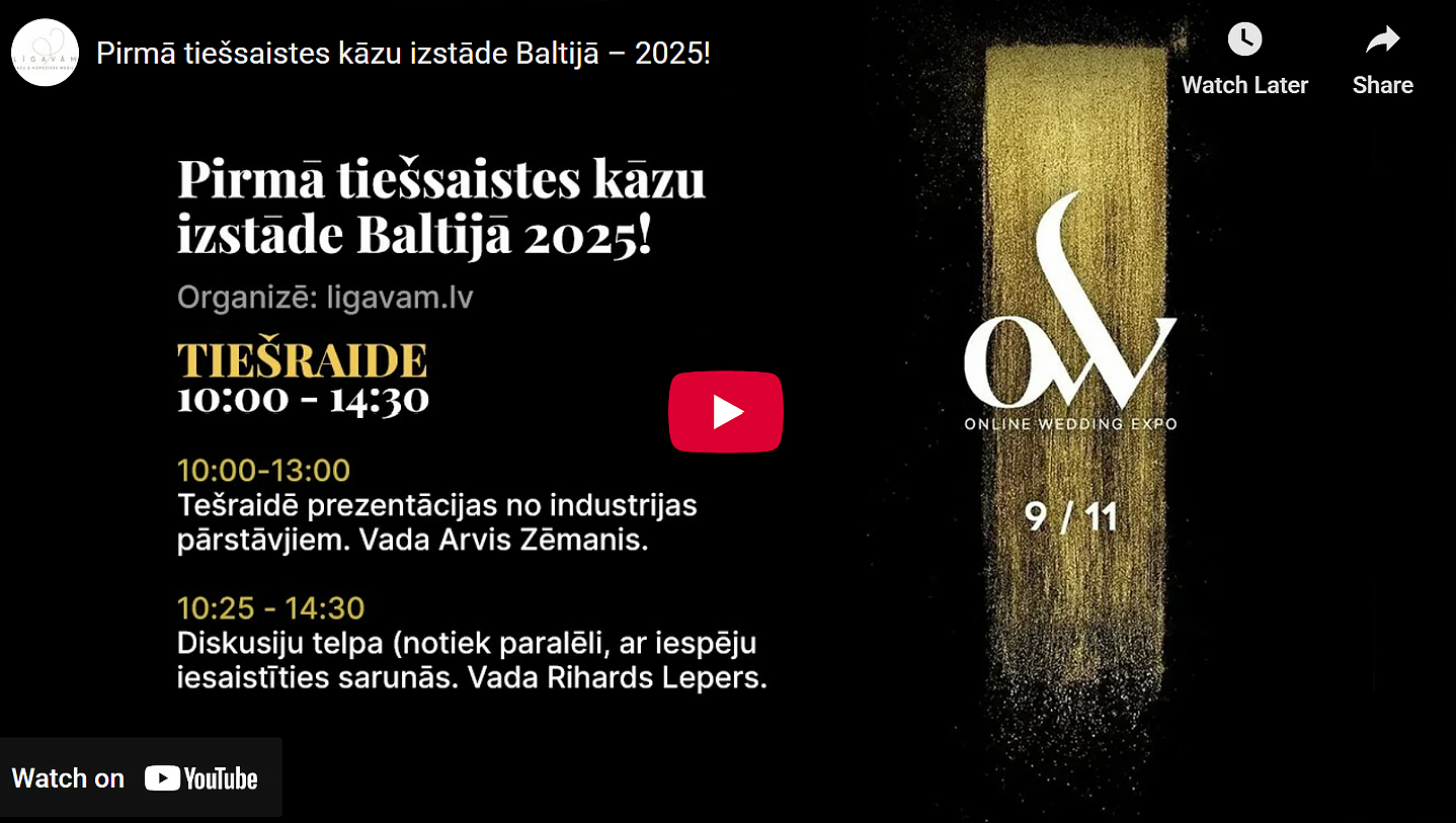 Tiešsaistes kāzu izstāde notika 9.11.2025. – dienā, kad LĪGAVĀM svinēja savu desmitgadi grandiozā grāmatžurnāla VOL XVIII atklāšanas svētkos ar vērienīgu modes šovu “Sakrālā savienība”. Modes šovu ar mākslinieku Samantas Tīnas, Riharda Zaļupes un Andreja Osokina uzstāšanos skati šeit: