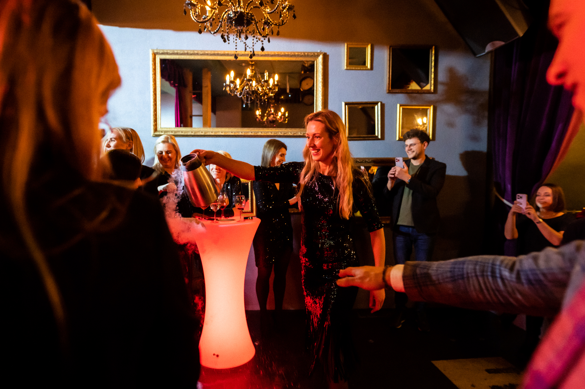 My main service – liquid nitrogen performance: a visually striking and interactive show that becomes a standout highlight of the evening. My performances are based not only on visual impact, but also on a deep understanding of event dynamics – experience gained from working with personalized wedding ceremonies, where emotions, storytelling, and human interaction are key.